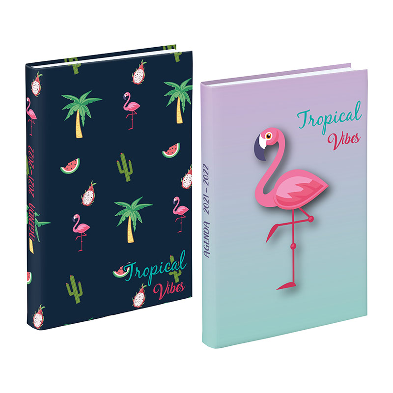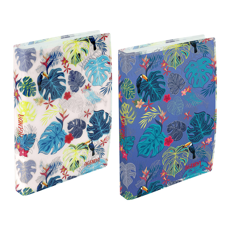 Nous continuons ce voyage du côté des agendas, notamment avec l’agenda TROPICAL en PVC imprimé avec des visuels tropicaux et l’agenda NEON avec ses néons en forme de flamant rose et de cactus.