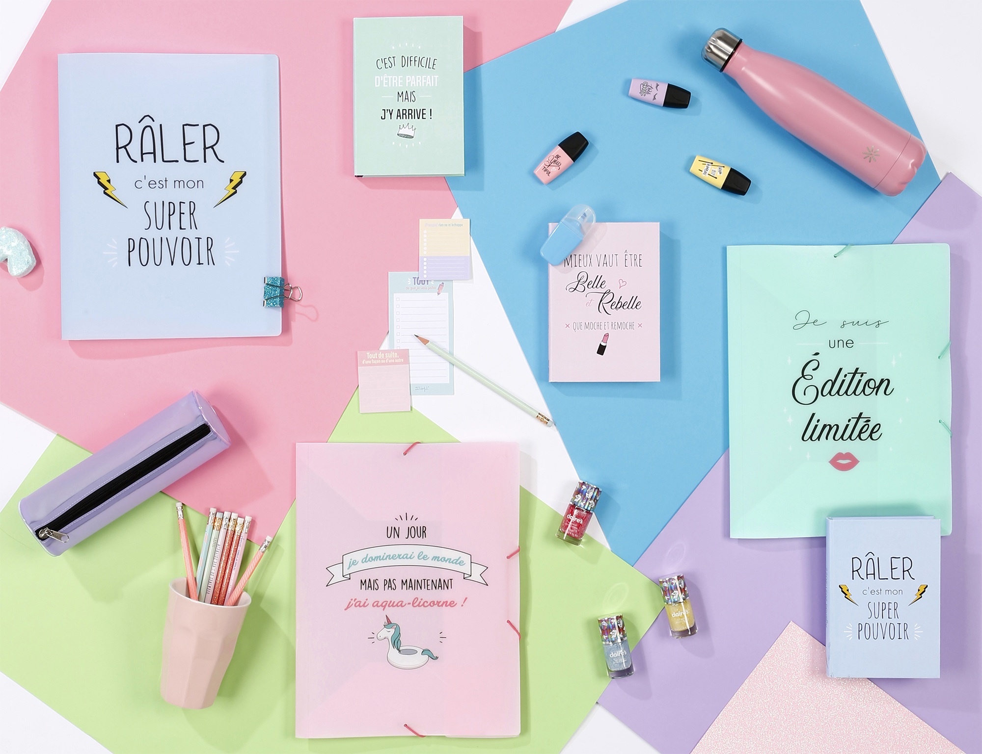 La gamme de papeterie Edition Limitée (fabriquée en France) qui permet de taquiner sa moitié avec un message humoristique : « Râler est mon super-pouvoir », « Mieux vaut être belle et rebelle que moche et remoche », « C’est difficile d’être parfait mais j’y arrive », « Je suis une Edition Limitée » ou bien encore « Un jour je dominerai le monde, mais pas maintenant j’ai aqua-Licorne ».