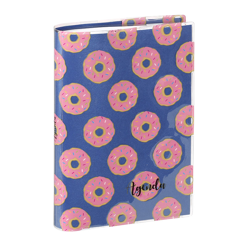 Cet agenda CANDIES a la spécificité d’avoir une couverture type protège-agenda en PVC imprimé avec un fond légèrement irisé grâce à une feuille intégrée.