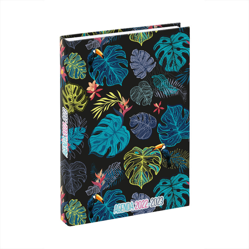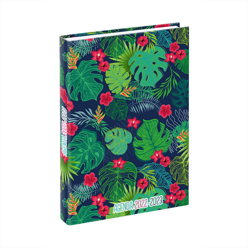 Cet agenda TROPICAL est rembordé en carton rigide avec une finition en pelliculage brillant.