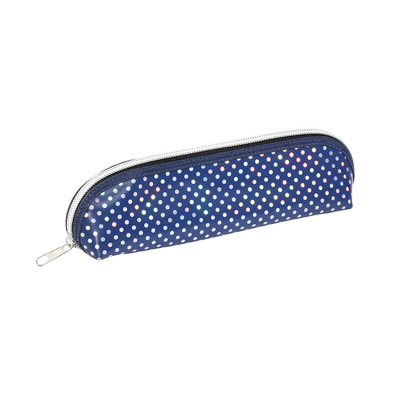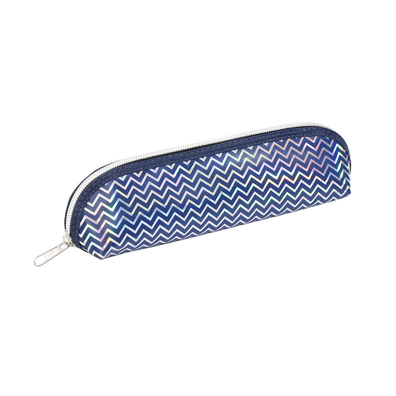 La trousse Ocean en PU avec des reflets holographiques argentés est de forme triangulaire et possède un compartiment avec un zip en argent, un curseur en métal argent et un biais bleu autour du zip.