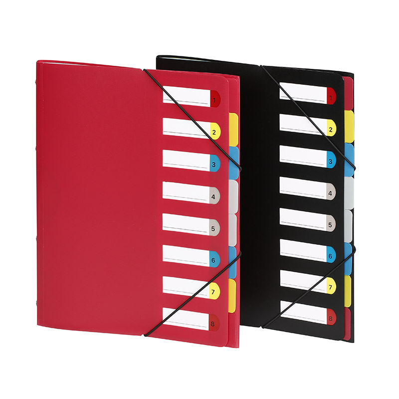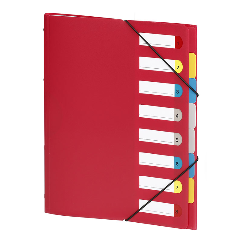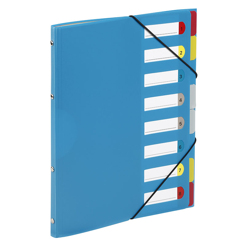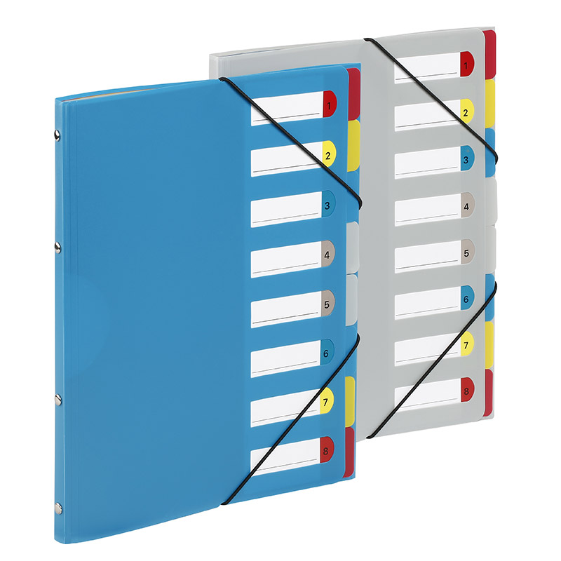 Il possède 8 compartiments, un grand porte-étiquette avec numérotation et un rabat pour un meilleur maintien des documents A4.