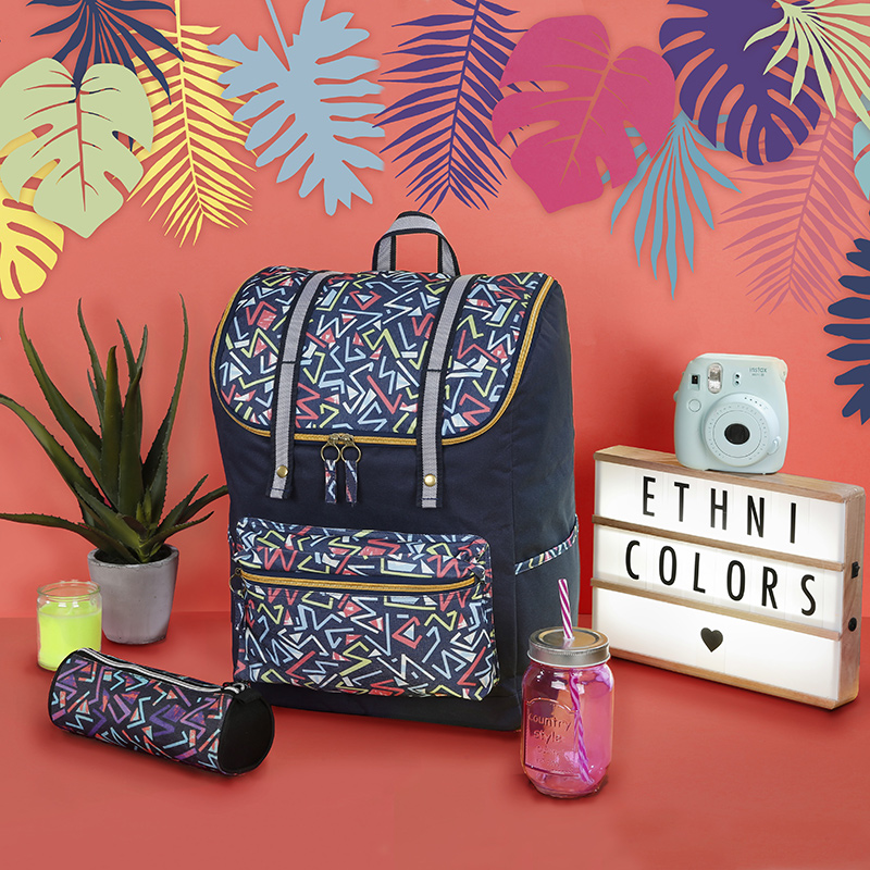 Un imprimé coloré et graphique a été intégré par touches dans un sac à dos uni afin de démocratiser l’imprimé ethnique. Trois produits ont été développé avec cet imprimé : une trousse ronde avec deux coloris au choix ; un sac à dos borne noir, ainsi qu’un sac à dos avec une forme fashion unique bleu marine. Le tout a été agrémenté d’une petite touche féminine avec une fermeture à glissière dorée ou argenté en fonction du coloris dominant du produit. Le sac à dos fashion a l’avantage d’avoir une ouverture/fermeture qui facilite le remplissage du sac avec un grand angle d’ouverture.