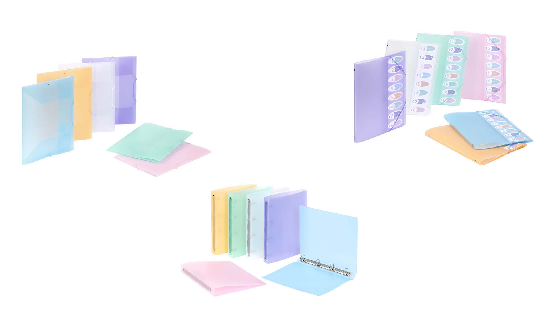 Cette gamme propose des classeurs, des chemises, des boîtes de classement, des porte-vues et aussi des agendas de couleur bleu pastel, rose pastel et vert pastel.